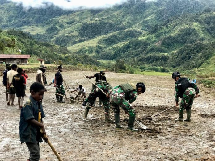 Ruslan-Rahman, Nduga | Personel Satgas Yonif Raider 321/GT/13/1 Kostrad Pos Yigi bersama Masyarakat Distrik Yigi gotong royong membangun dan membersihkan Bandara bertempat di Distrik Yigi, Kabupaten Nduga, Papua.