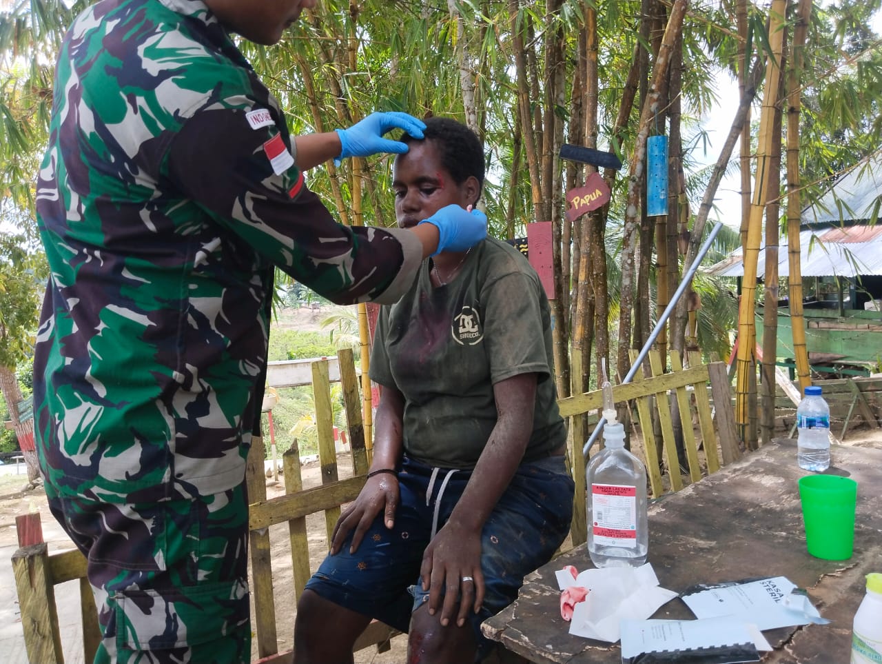 Tamtama kesehatan Pos Skamto langsung memberikan perawatan kesehatan terhadap korban yang mengalami pendarahan di bagian kepala lalu mengehentikan pendarahan tersebut dan membersihkan luka-luka kecil lainnya.